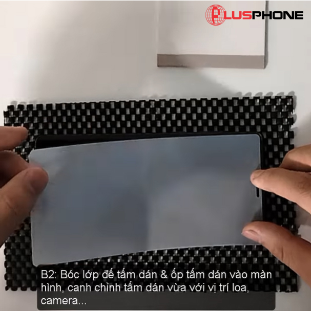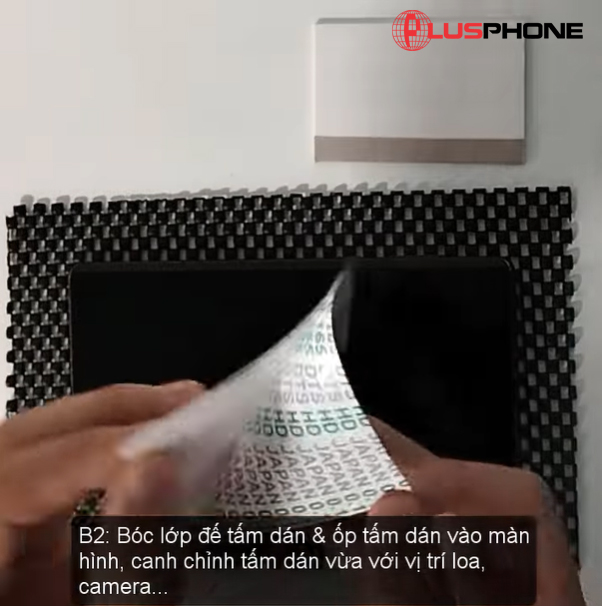 Bước 2 : Bóc lớp đế tấm dán, canh chỉnh vị trí tấm dán cho trùng với các lỗ loa, camera… (xem ảnh dưới)